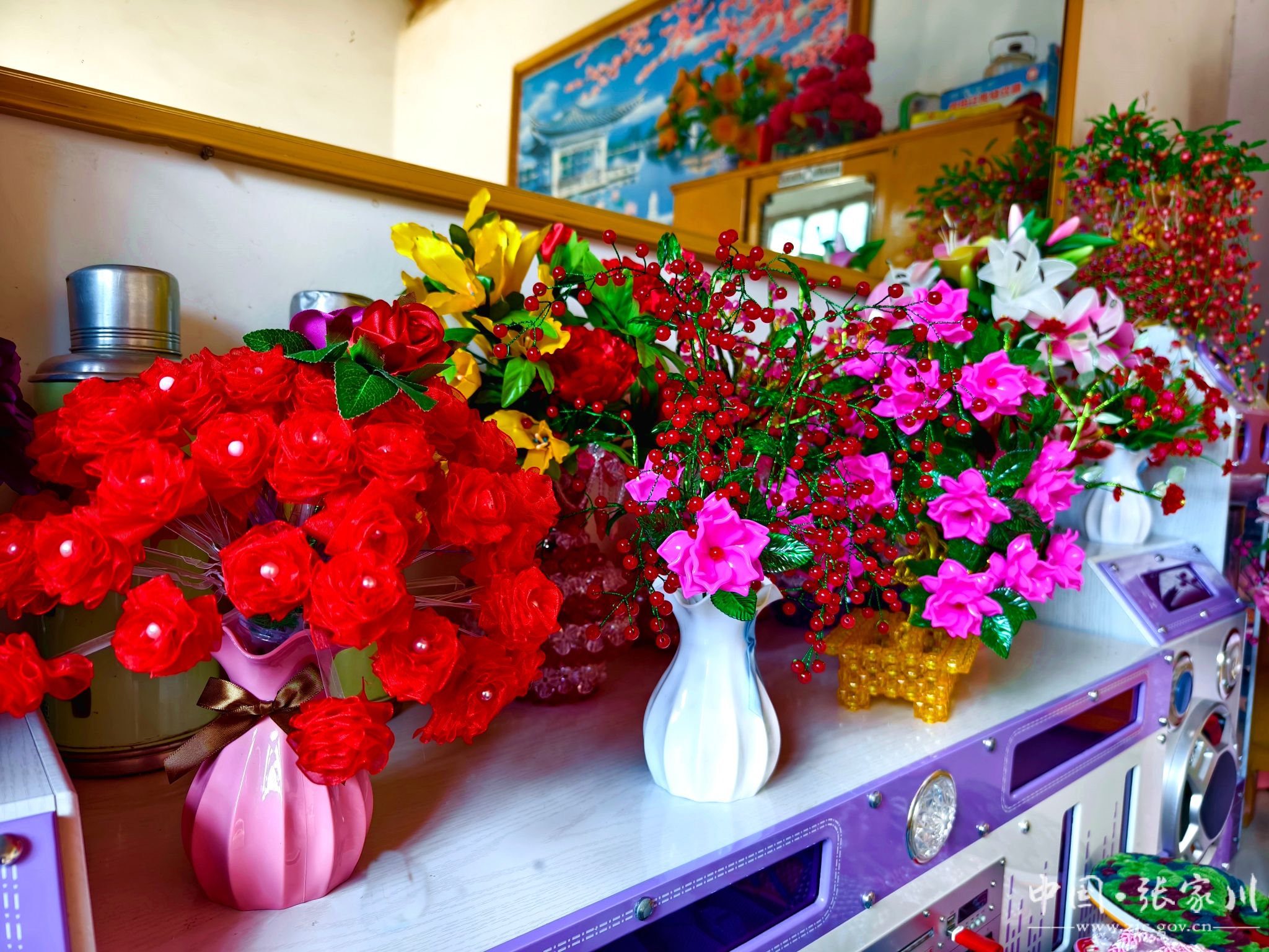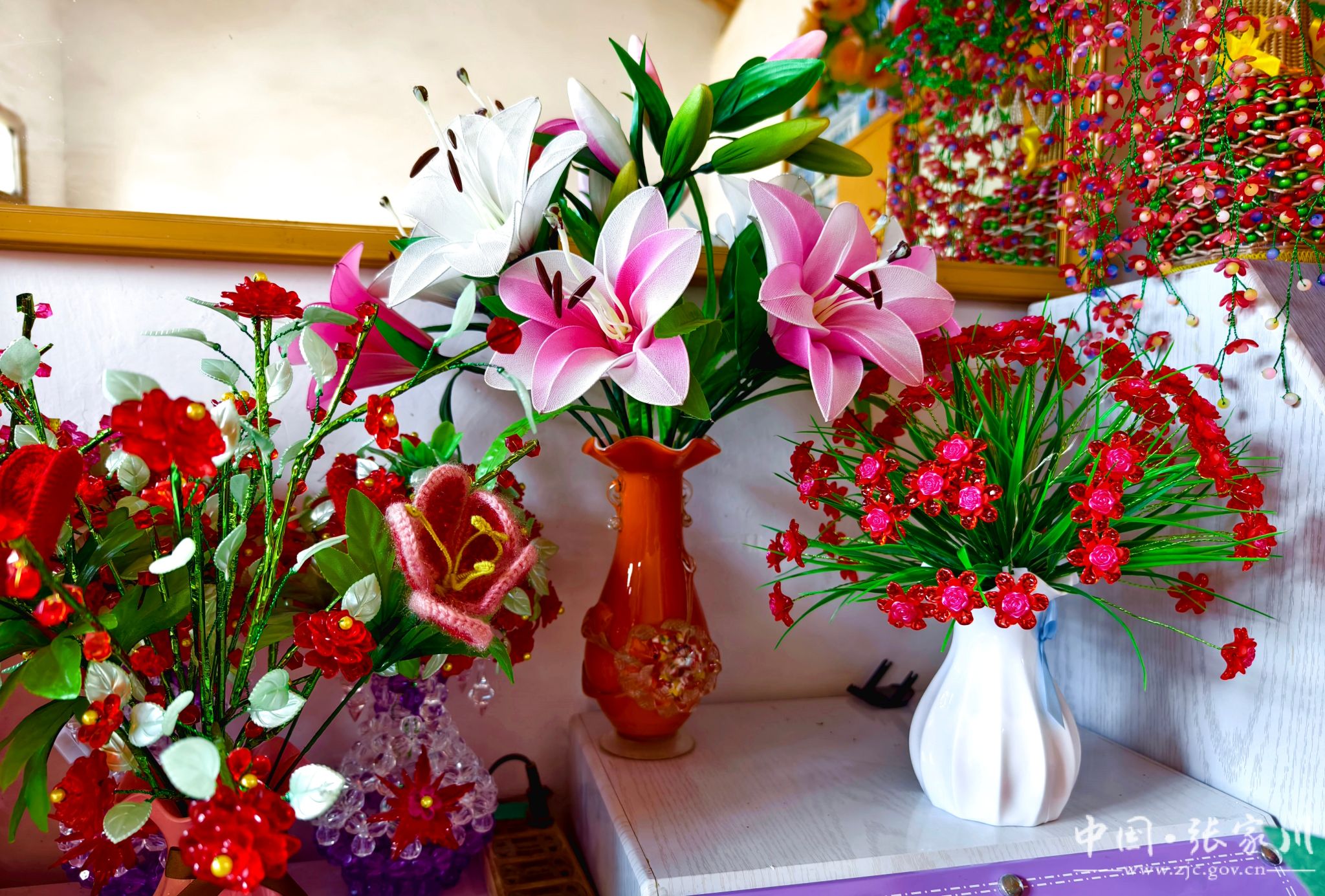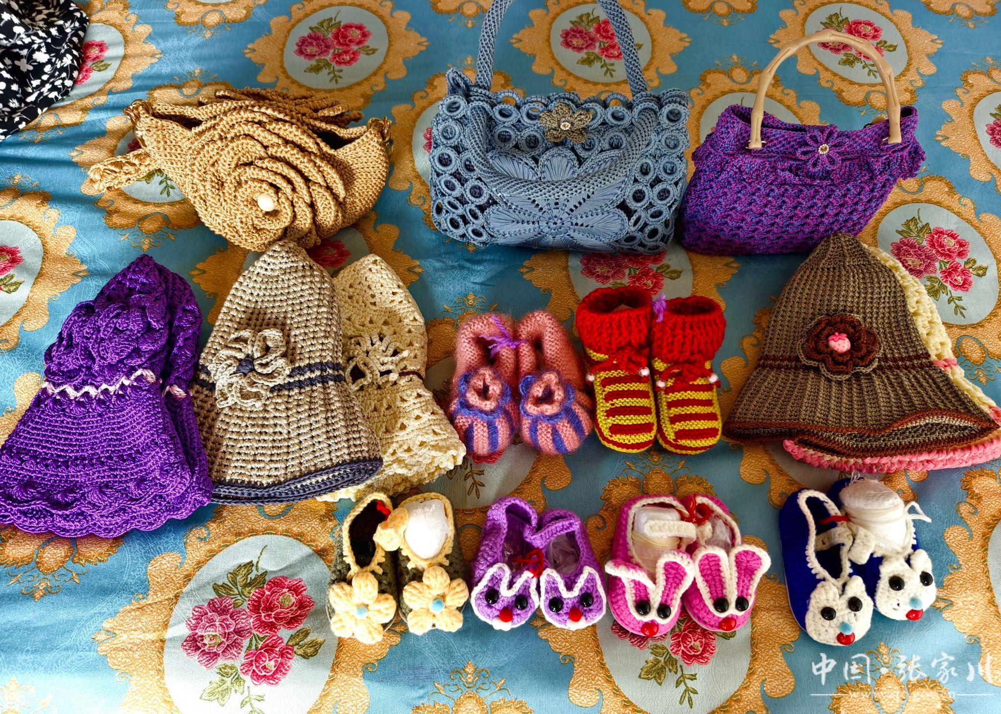 在大庄村21号糟海者家里,我们见到了她正在带领家庭妇女进行手工编织,她们用一双双巧手编织出一件件精美的作品。逼真的各类珠花、绢花手工艺品、实用的纸巾盒、卡通可爱的儿童鞋子,以及样式新颖的成人帽子、包包和鞋子,这些都是出自于手工编织能手糟海者和她的姐妹们。
