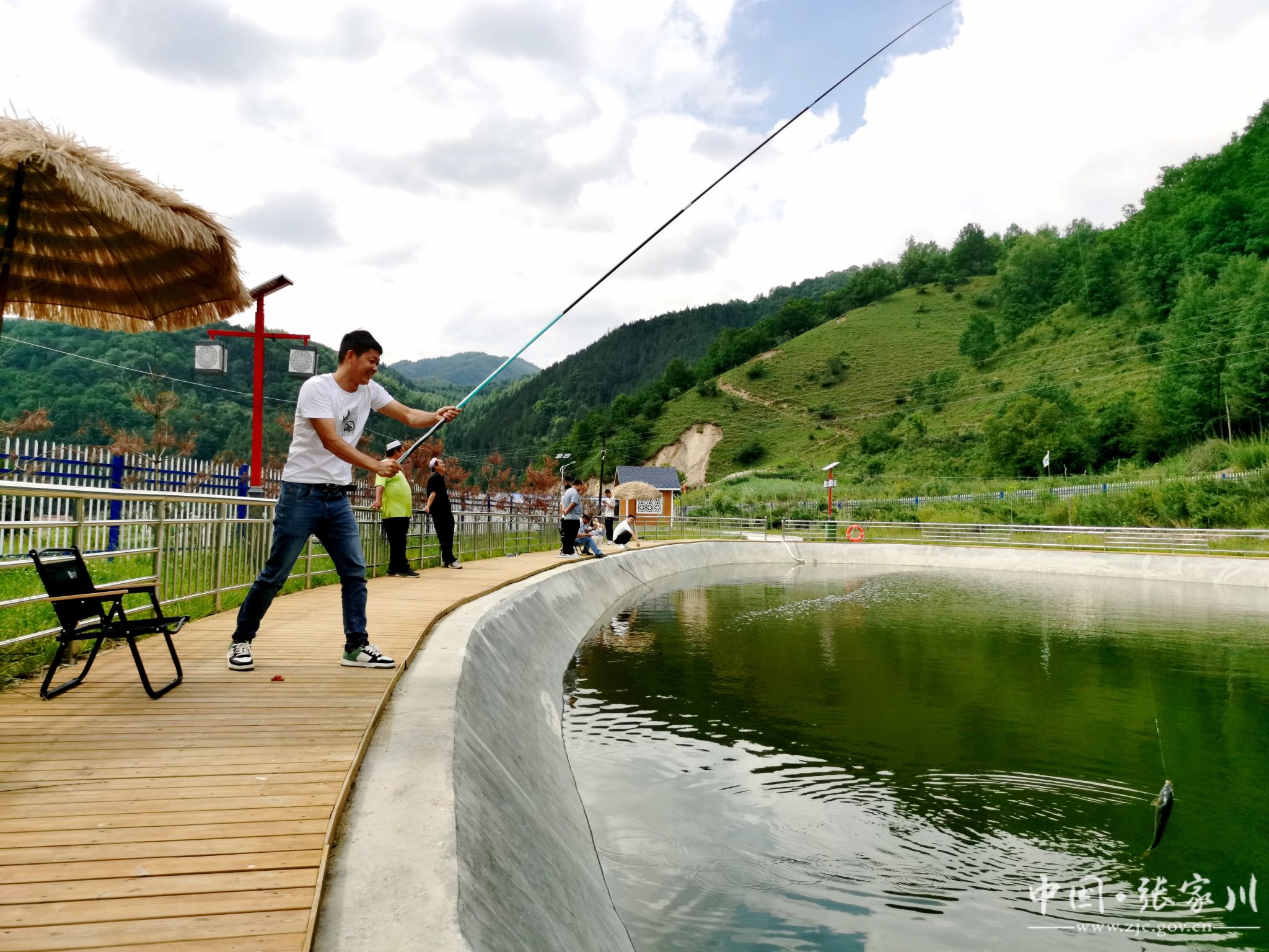 在张家川县闫家乡车古村垂钓园内,鱼塘里粼粼波光与蓝天白云相映,垂钓者静坐一排,手握钓竿、调鱼漂、挂饵料,静心等待鱼儿上钩。