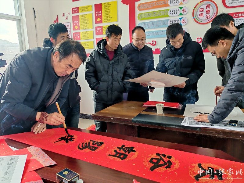 送春联现场,书画爱好者按照村民不同的需求,笔走龙蛇,一副副春联、一张张“福”字洋溢着对群众美好生活的祝福,吸引着一拨又一拨村民们。