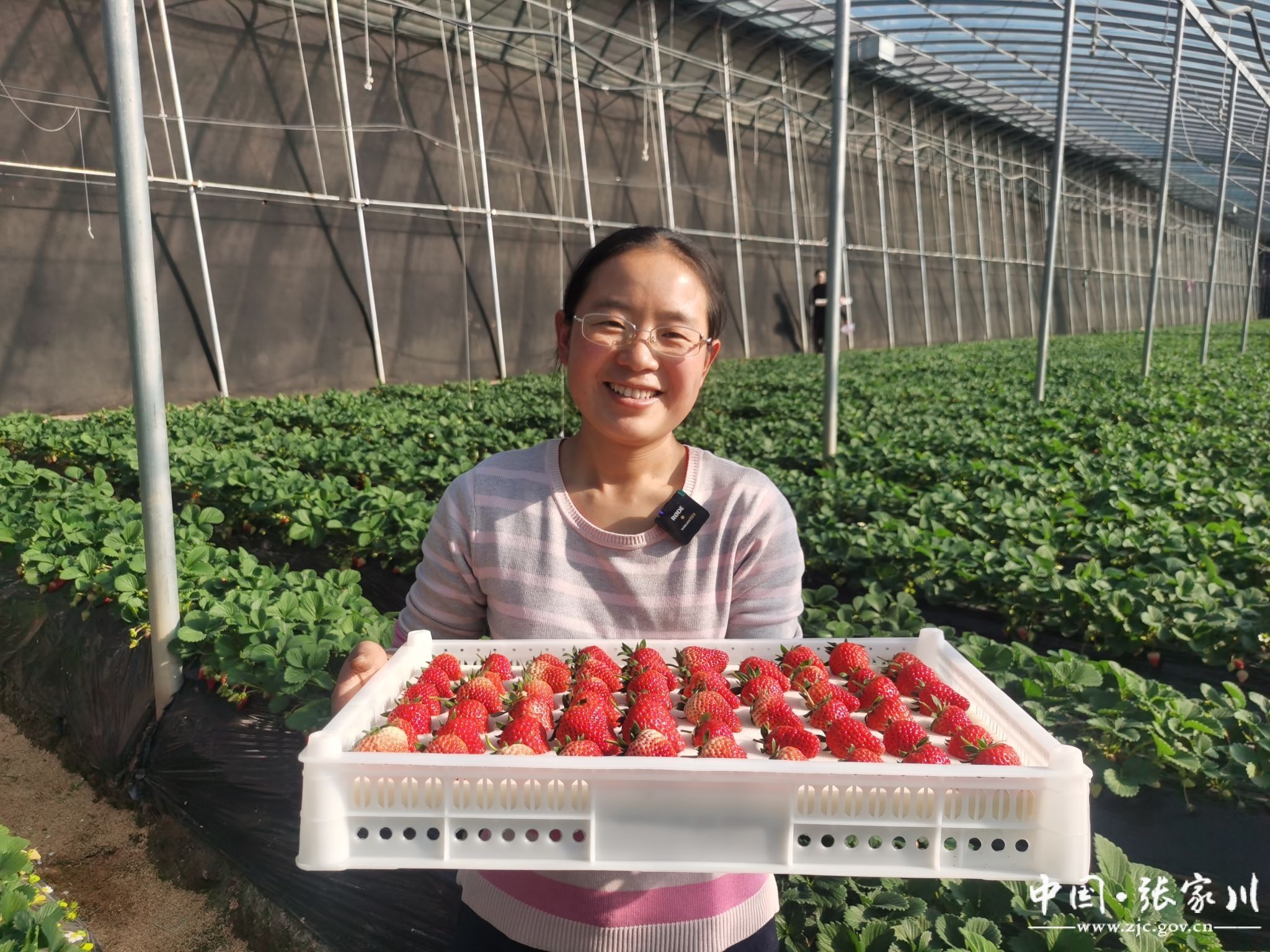 该合作社的采摘师傅马粉琴是马鹿镇长宁村人,她说,在棚里每天采摘草莓,能挣100元,还能照顾到家里小孩。