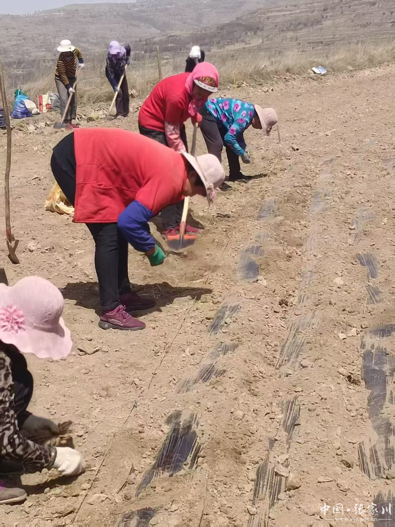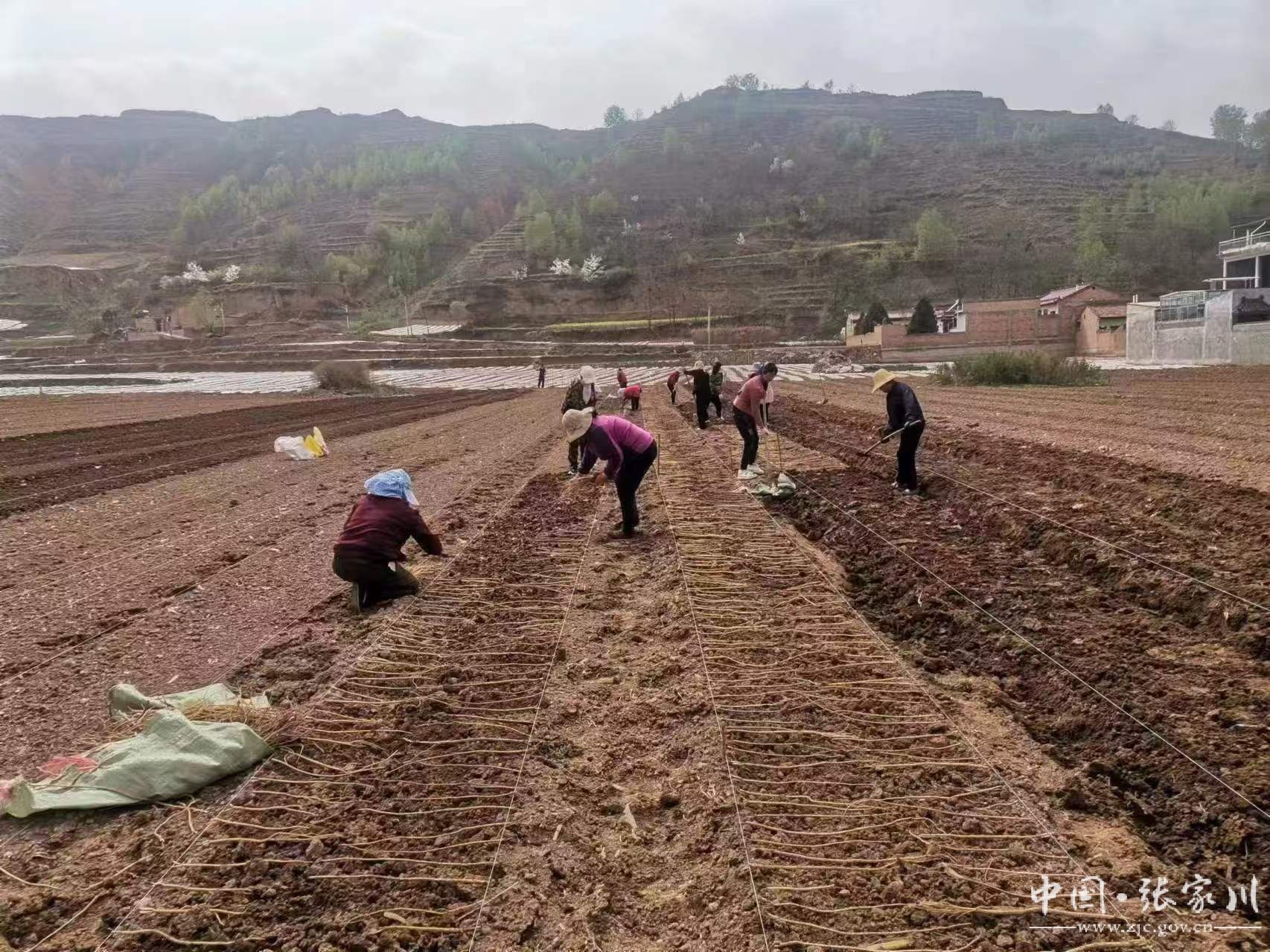 春种正忙,就近务工群众两两一组、互相协作,正在大阳镇中药材种植示范基地内弯腰点种覆膜,锄头起落间新土翻飞,药苗成行入土,药香混着泥土气漫山飘散。