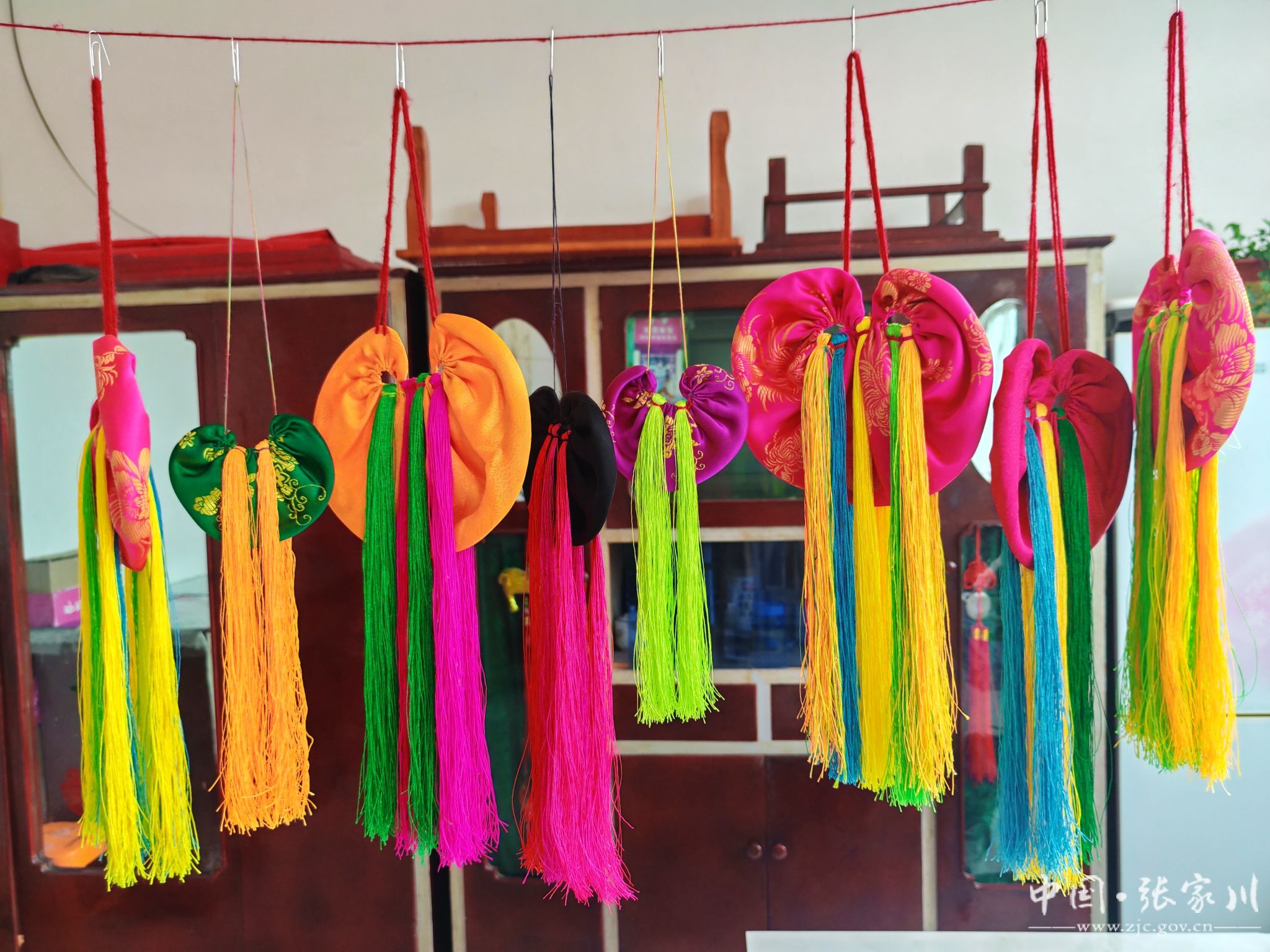 这会儿,付川村的李水萍家已经聚满了人。彩线在姐妹们手里上下翻飞,清亮的小曲声飘得老远:“秀一个荷包戴,绸缎裹着来,将五星的花线买呀嘛回来……”王会香是村里有名的“快嘴巧娘”,说话时总爱拍手笑,绣针在她指尖“嗒嗒”飞,比小曲的节奏还快。她说,那几个是她妈妈留给她的,这几个是她用粉色细线钩的荷花荷包,花瓣层层叠叠,里头塞满新割的艾草,还没绣完,就被人抢着预订:“给我留一个!这模样摆在店里,准能卖爆!”