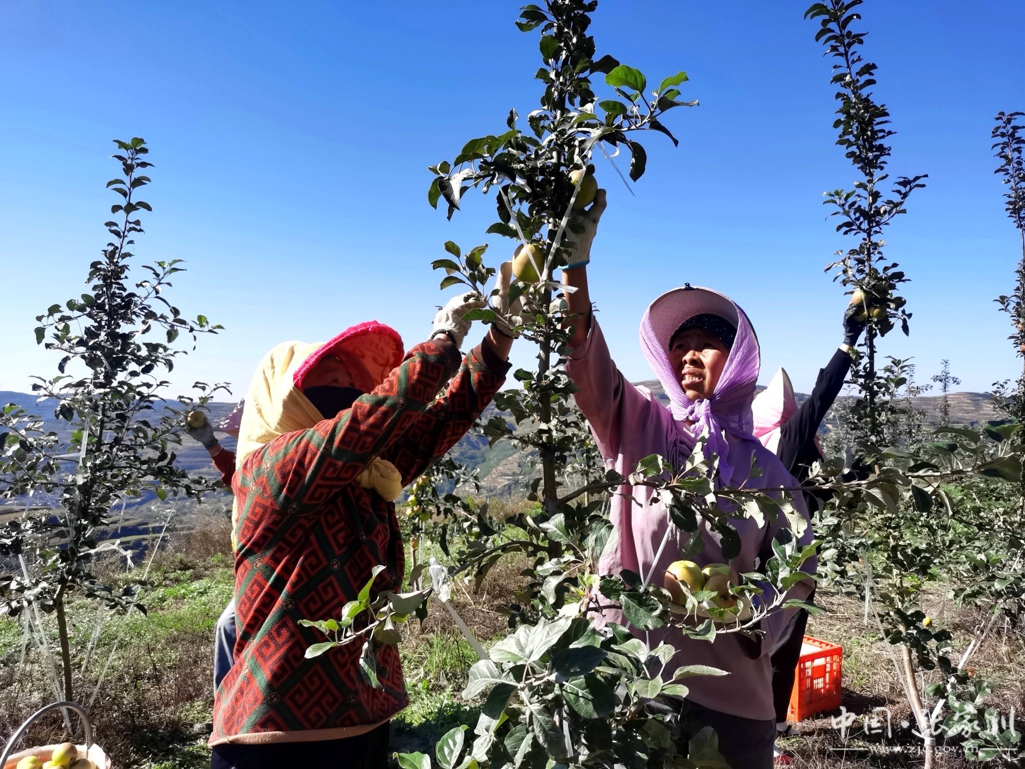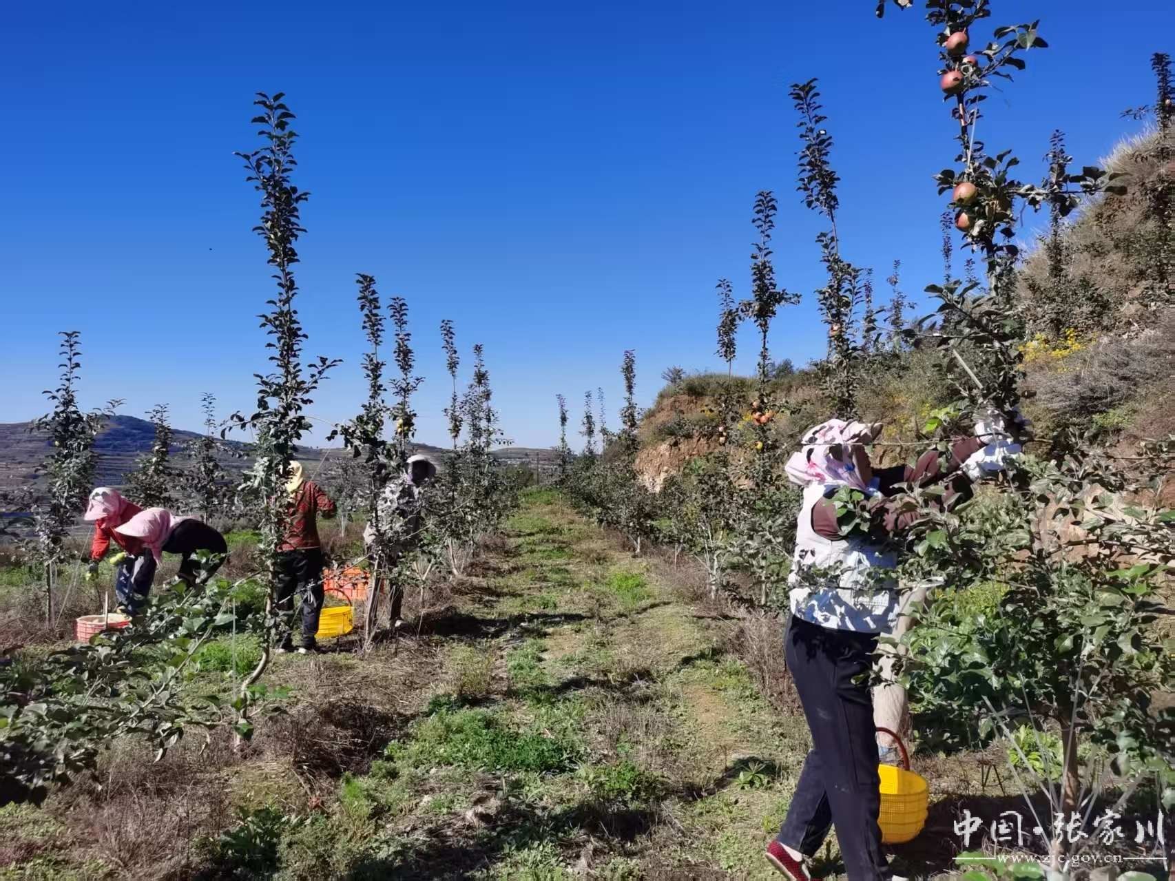10月13日,趁着天气放晴,张家川县连五乡贠家村建峰丰盛种养殖农民专业合作社的瑞雪苹果迎来采摘,来自本村的三十余名工人,手提果篮,穿梭在果园,开始一天的忙碌采摘。