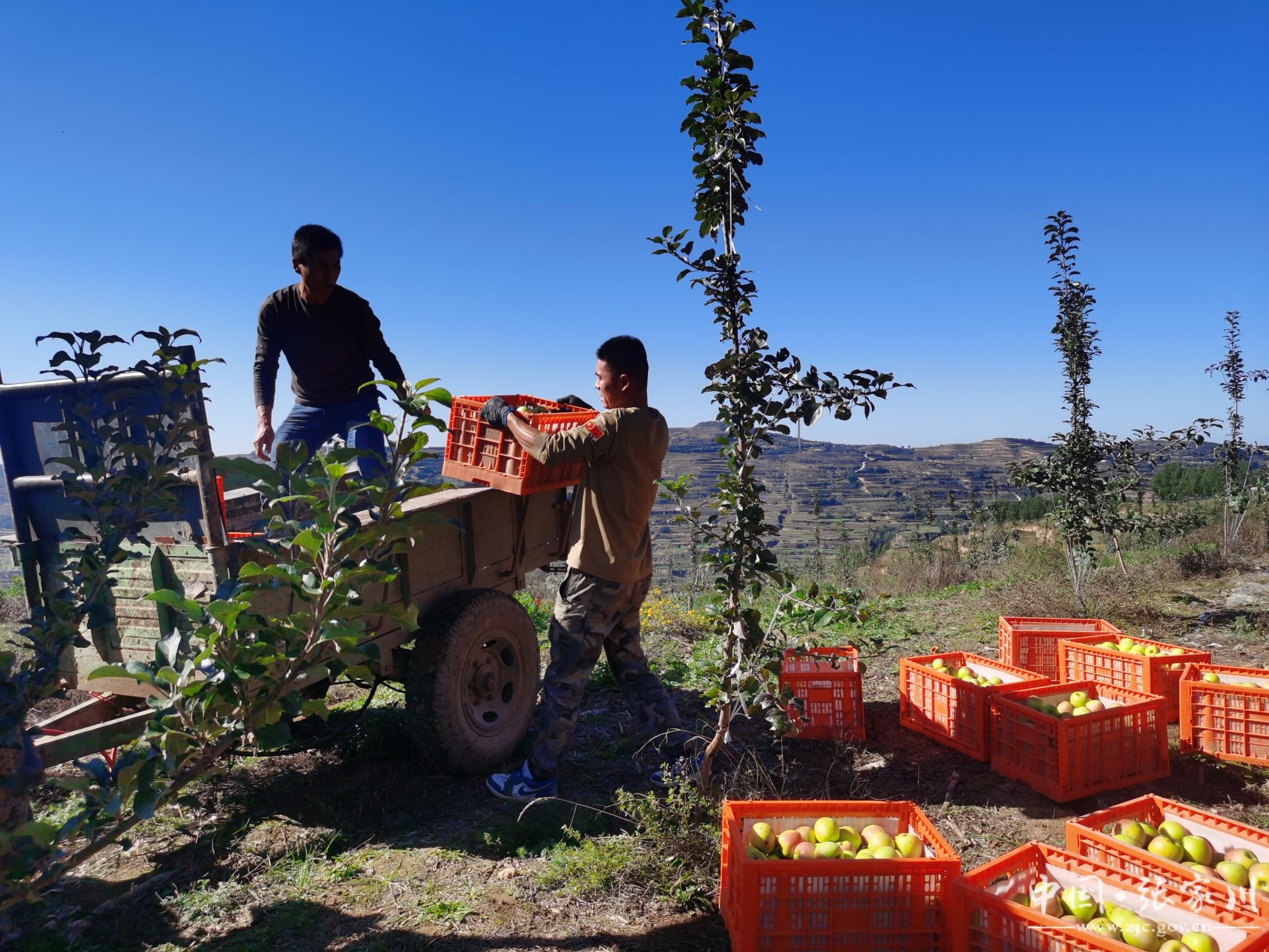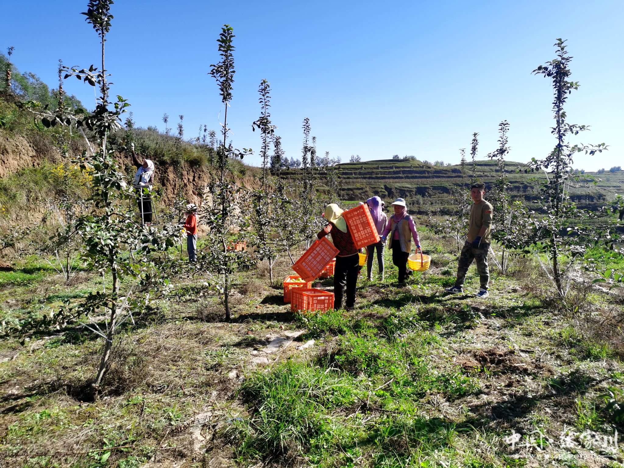 果园主人哈建峰一家三代,喜笑颜开地加入到采摘工人当中,分拣、装筐、搬运,一家人忙得不亦乐乎。