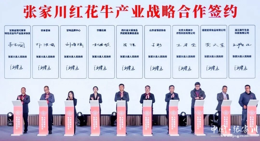 好产品得有好招牌。2025年12月,张家川红花牛区域公用品牌战略发布会在兰州重磅启幕,“伊味思”“关山牧歌”等品牌集体亮相,鲜切牛肉、手撕牛肉干等产品引来试吃长龙,战国马车造型的展台更让文化与美食碰撞出别样火花。在此之前,红花牛已在第十八届牛业发展大会上斩获铜奖,入选“甘味”品牌和无公害认证,全产业链发展方案成为行业样板。品牌赋能让红花牛身价倍增,市场收购价每斤比普通牛肉高出2-3元,养殖户每养一头牛能多赚钱。“现在我们养的不是普通牛,是张家川的文化招牌!”李旭升在观看发布会时,看着络绎不绝的合作意向, 激动不已。