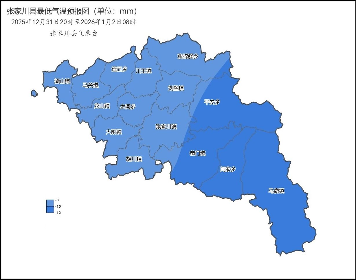 图2 张家川县2025年12月31日20时至2026年1月2日08时最低气温预报图
