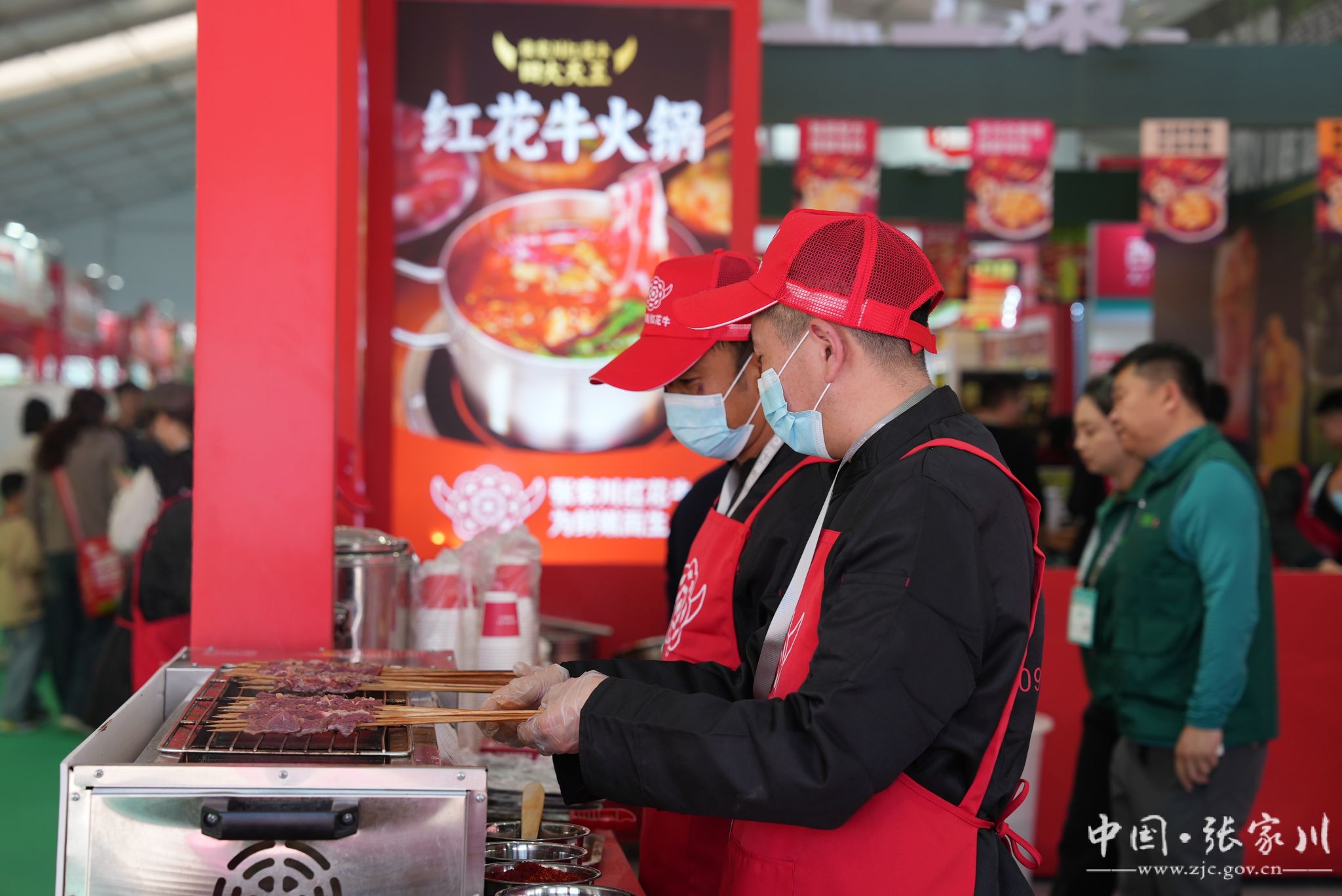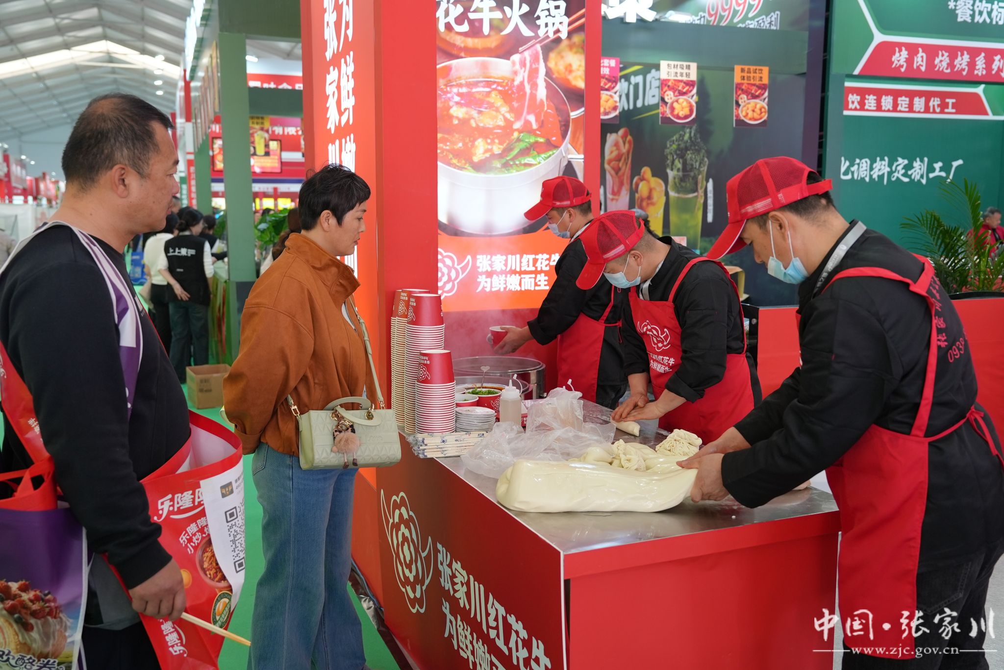 “滋滋”的烤肉声、翻滚的面汤声、沸腾的火锅声交织成一曲热闹的“美食交响曲”。烤肉架上,红花牛肉在炭火上滋滋冒油,焦香四溢;牛肉面锅里,筋道面条裹着浓郁肉香,热气腾腾;红花牛肉火锅汤底醇厚,香气直钻鼻腔。试吃区前排起长龙,全国各地的客商与观众手持餐盘,有序等候品尝。
