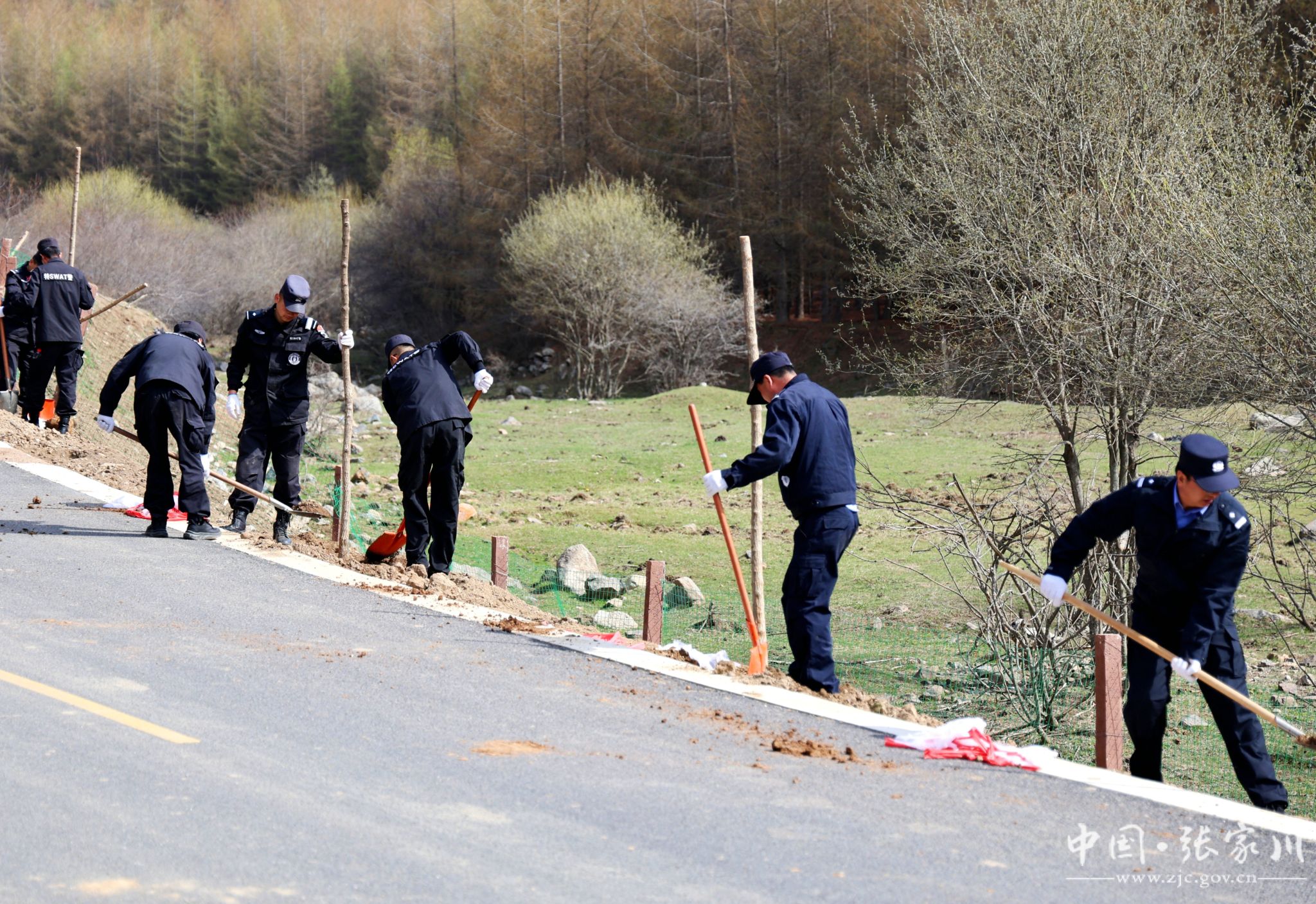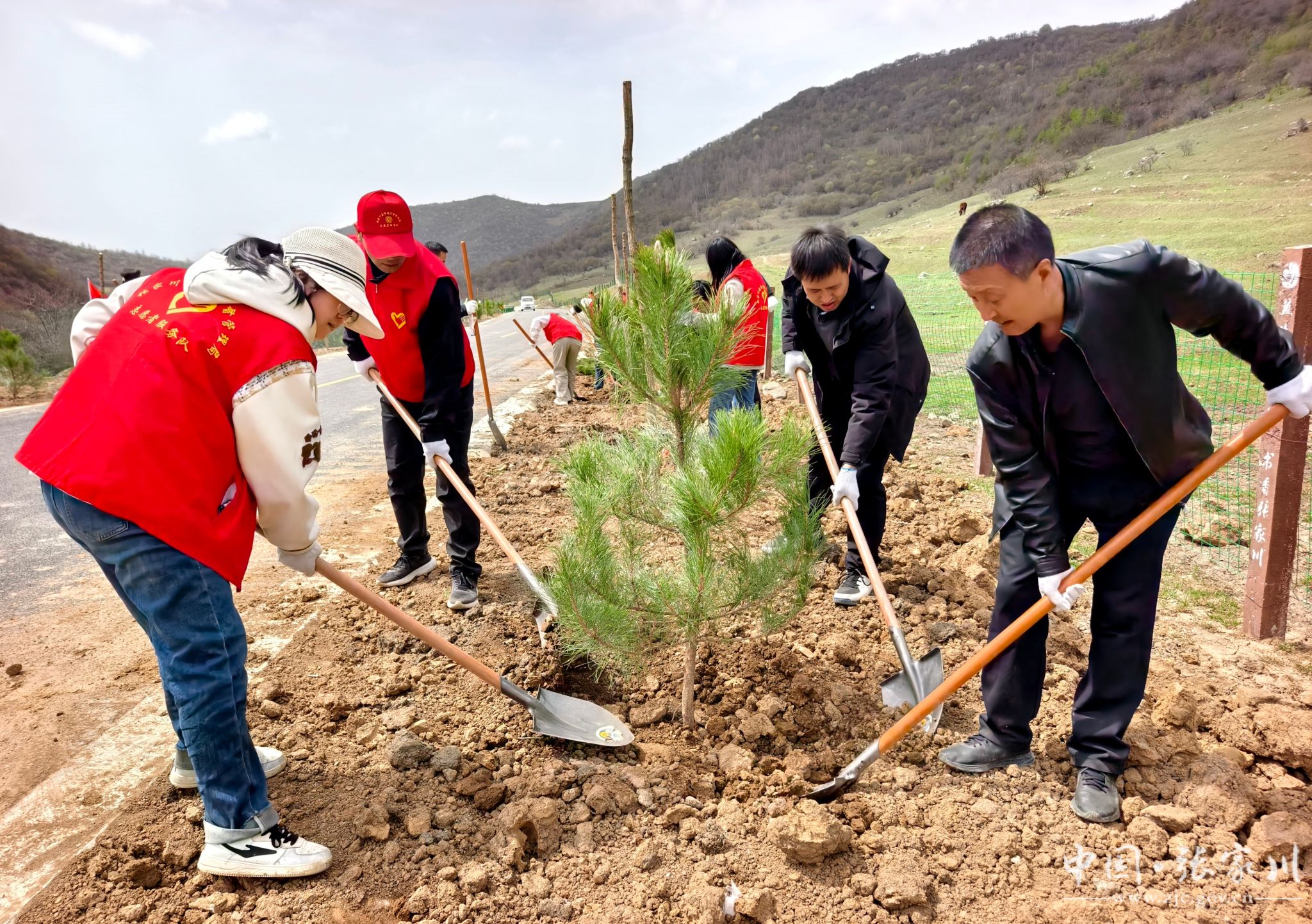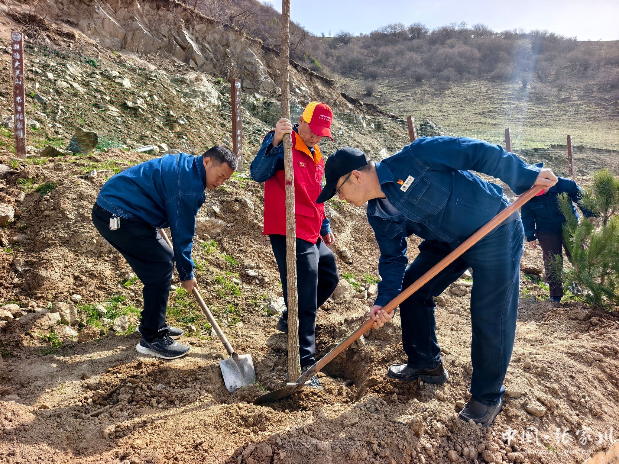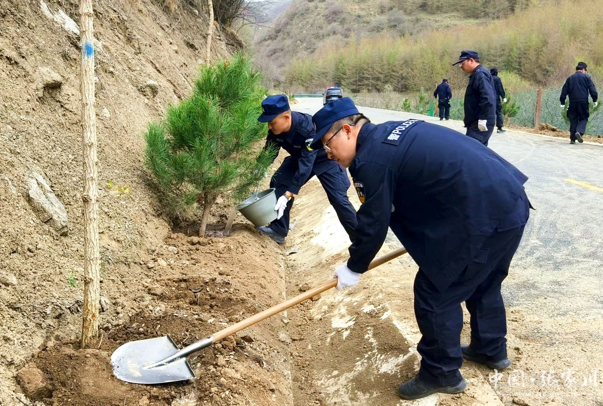 植树现场,干部群众分工明确、配合默契。大家严格按照植树技术规范,挥锹铲土、扶苗定植、培土围堰、精心浇灌,每一道工序都认真细致、规范操作。“虽然今天风有点大,但大伙儿的干劲很足。能亲手在关陇古道上栽下几棵树,为家乡添一份绿,再累也值得。” 正在挥锹培土的县水务局干部马智录笑着说。经过一番辛勤劳作,一株株新栽的油松和五角枫错落成行、迎风挺立,为春日的关陇古道增添了盎然生机。