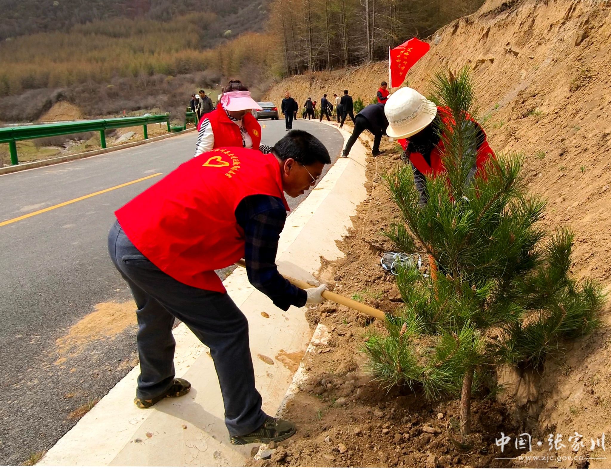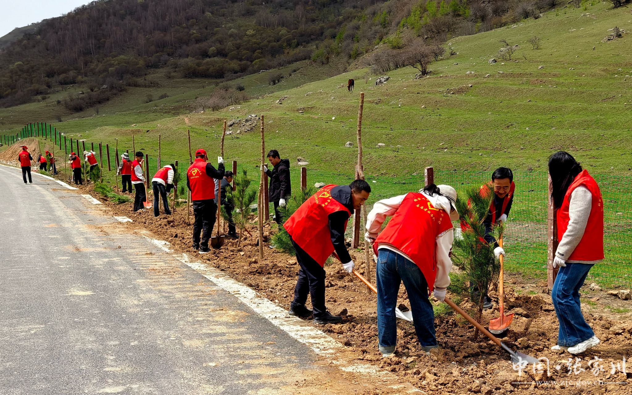 4月13日,张家川县关陇古道风情线沿线一派热火朝天的劳动景象。来自全县的干部群众齐聚平安乡赵安村至张棉驿乡周家村路段,开展春季行道树栽植活动,在22公里的道路沿线共栽植油松和五角枫7348棵,为古道增添了一道靓丽的绿色风景线。