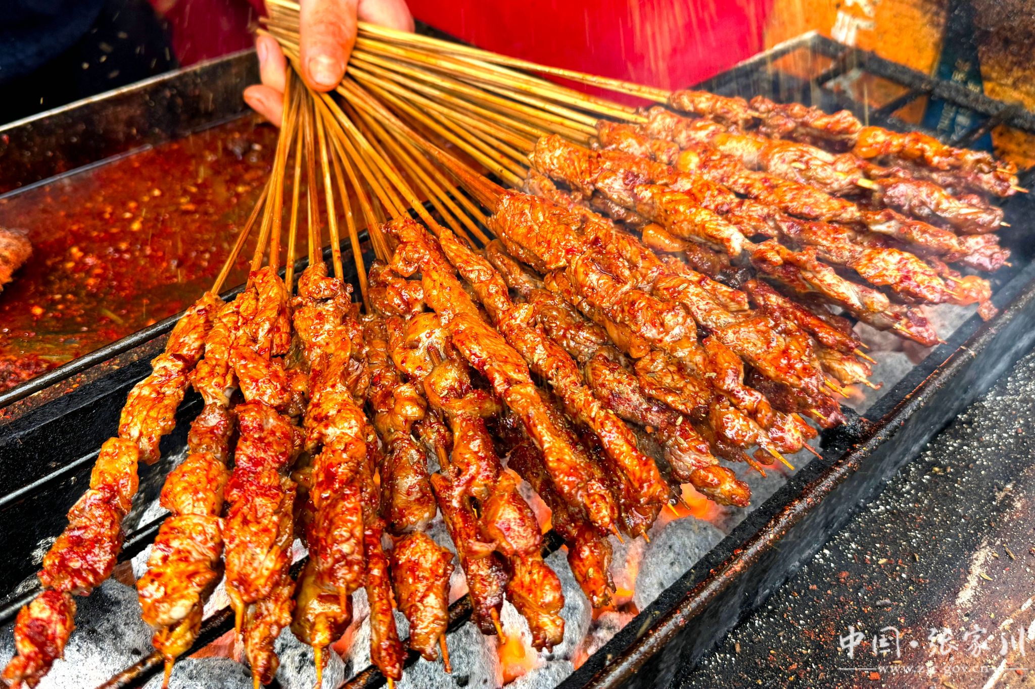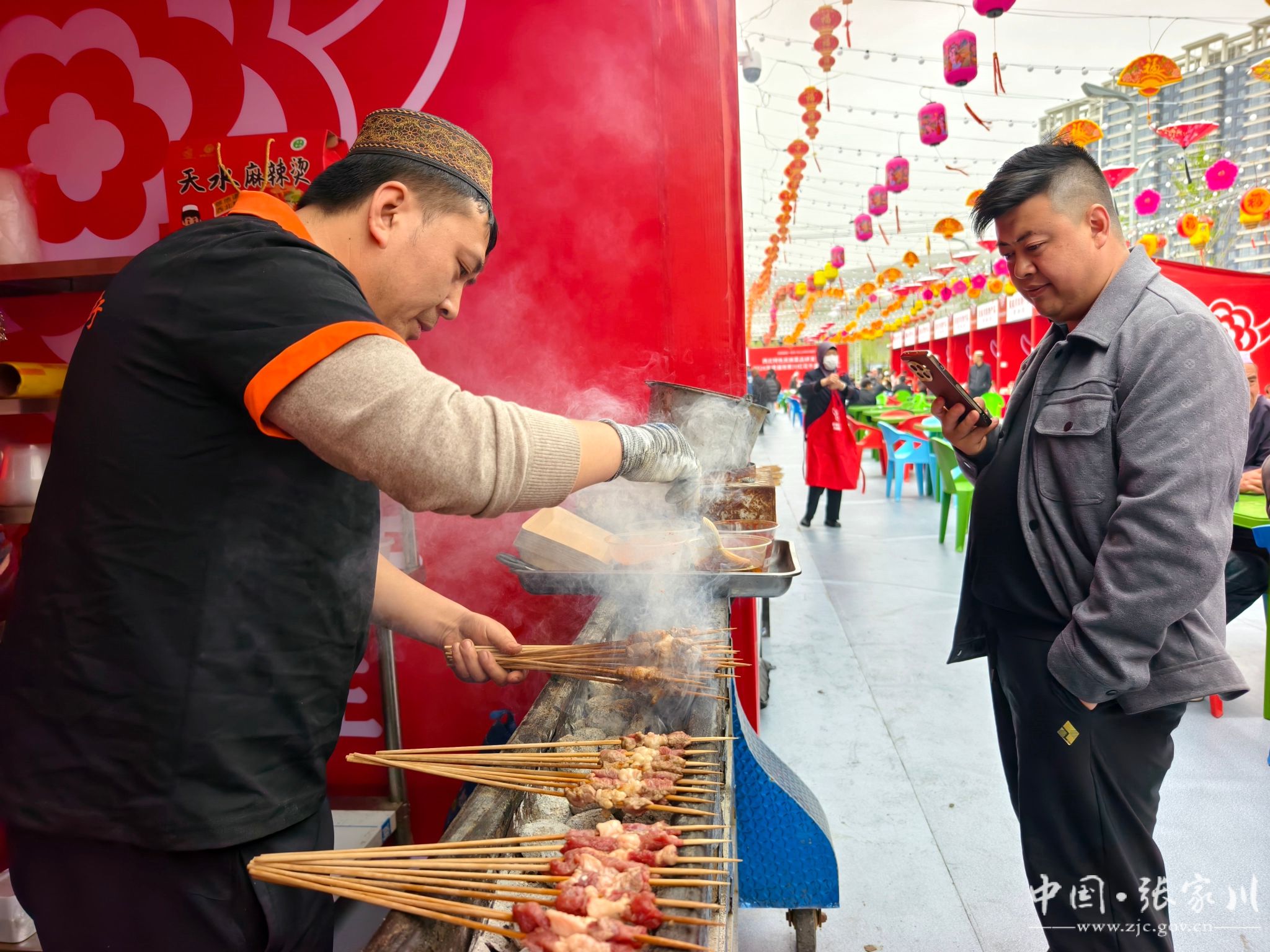 走进美食汇现场,80个特色摊位整齐有序排布,15家美食街商户悉数入驻,各个摊位前人头攒动,吆喝声、谈笑声、餐具碰撞声交织在一起,汇成一曲热闹的市井欢歌。作为本次活动的主角,张家川红花牛美食凭借独特风味圈粉无数,成为现场最亮眼的存在。炭火上的烤肉串滋滋冒油,香气扑鼻,摊主不停翻转刷料,金黄焦香的肉串刚出炉就被食客抢购;大锅现煮的牛骨热气腾腾,浓郁肉香飘散四方,软烂入味的肉质让人大快朵颐;鲜香醇厚的红花牛火锅、麻辣爽口的麻辣烫,满足了不同游客的口味需求。