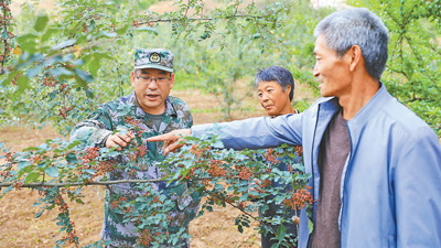 张洪峰(左一)和群众一起探讨花椒培育技术。