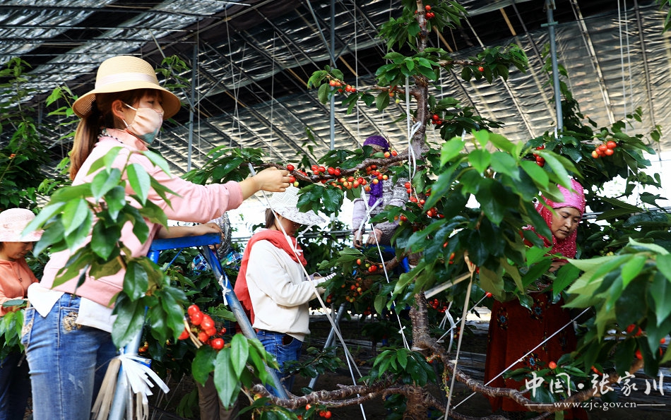 4月29日,碧空如洗,微风和煦。位于张家川县龙山镇马河村的裕丰果品专业合作社,连片的温室大棚格外引人注目,大棚里面,一枚枚红玛瑙般的大樱桃挂在枝头,玲珑剔透、娇艳诱人,不时飘出阵阵甜香,让人垂涎欲滴,引得游客纷至沓来。