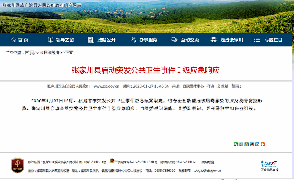 1月27日12时,根据省市突发公共卫生事件应急预案规定,结合全县新型冠状病毒感染的肺炎疫情防控形势,张家川县启动全县突发公共卫生事件Ⅰ级应急响应,由县委书记陈晰,县委副书记、县长马筱宁担任双组长。