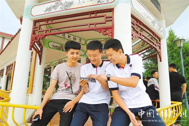 山丹培黎学校学生在手机上观看习近平总书记视察山丹培黎学校的视频。