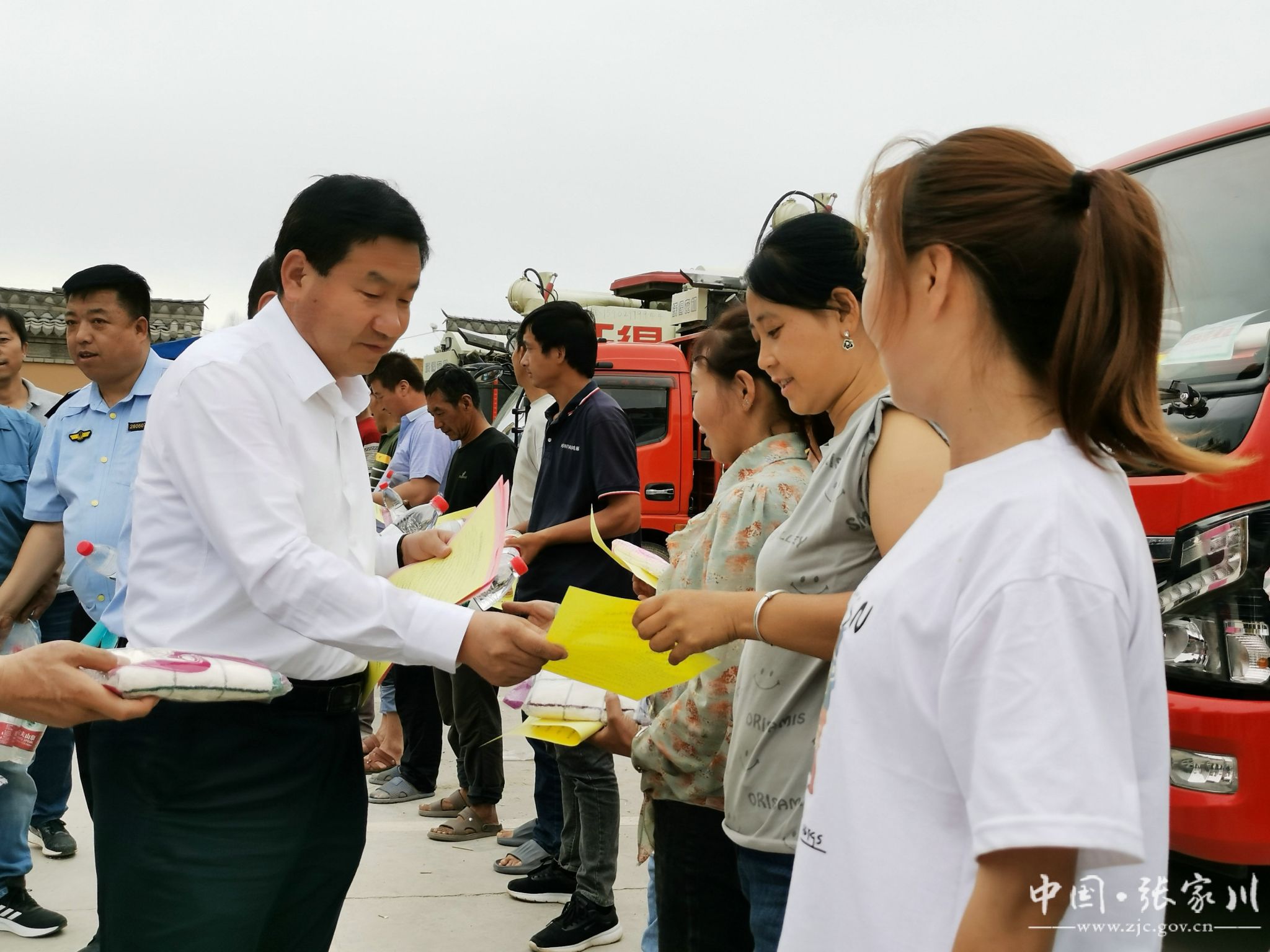 活动中为开展小麦机收作业的跨区域作业人员送去了矿泉水、毛巾等防暑物品,并叮嘱他们要特别注意田间安全,确保夏收机收作业正常、有序、安全进行。