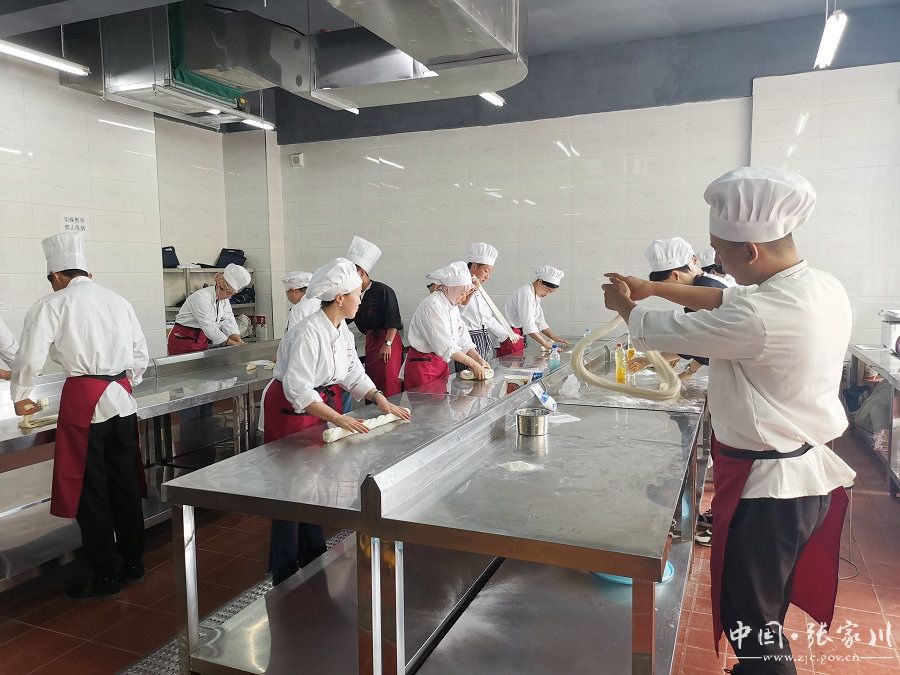 在培训基地的拉面教室,张家川县食源餐饮培训学校的老师正在认真地给每位学员教授拉面和炒菜技术,从和面揉面再到拉面,每个环节都手把手包教包会,当学员们拉出二细、大宽、韭叶等形状各异的牛肉面时,他们露出了成功的笑脸。
