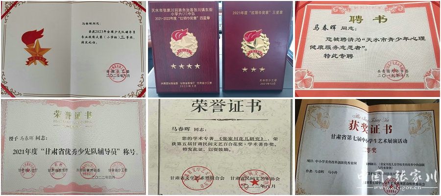 马春晖,张家川县张家川镇学区党建办公室主任、少先队总辅导员。2021年度荣获甘肃省“优秀少先队辅导员”称号,2023年被授予全县教育系统优秀党务工作者称号。在任辅导员期间,2021年度被天水市少工委评为“红领巾奖章”三星章集体,2022年被甘肃省少工委授予“红领巾奖章”四星章集体。近年来,他多次在省市县优质课示范课竞赛中获奖达10余次,辅导学生获得市级以上奖项11人(次)。先后在学术刊物发表论文12篇,出版个人专著2部,参与编著2部,获得甘肃省第五届百合花学术奖,主持完成省市级课题3项,其中《张家川优秀文化有效融入学校思政课堂教学研究》获得甘肃省“十四五”规划课题资助立项。