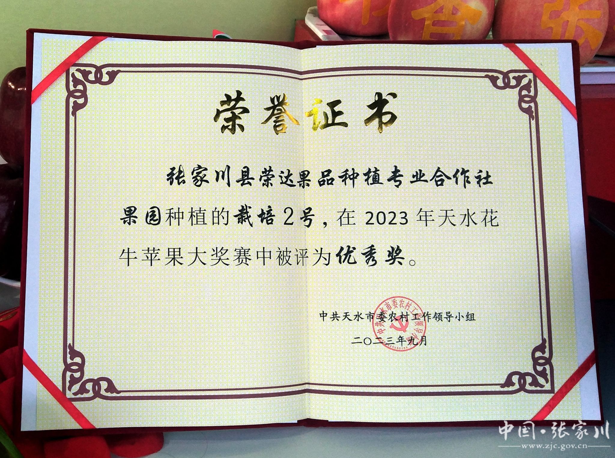 开幕上表彰了花牛苹果大赛获奖者,张家川县荣达果品种植专业合作社选送的花牛苹果新品种栽培2号喜获优秀奖,该合作社在近几年天水市举办的花牛苹果大奖赛已获金奖2次,优秀奖1次,此次获奖,是对其果园管理水平和果品质量的再次充分肯定,必将激励和提升全县果品生产者从事果园管理的信心和决心,推进全县果品产业较快发展发挥积极作用。