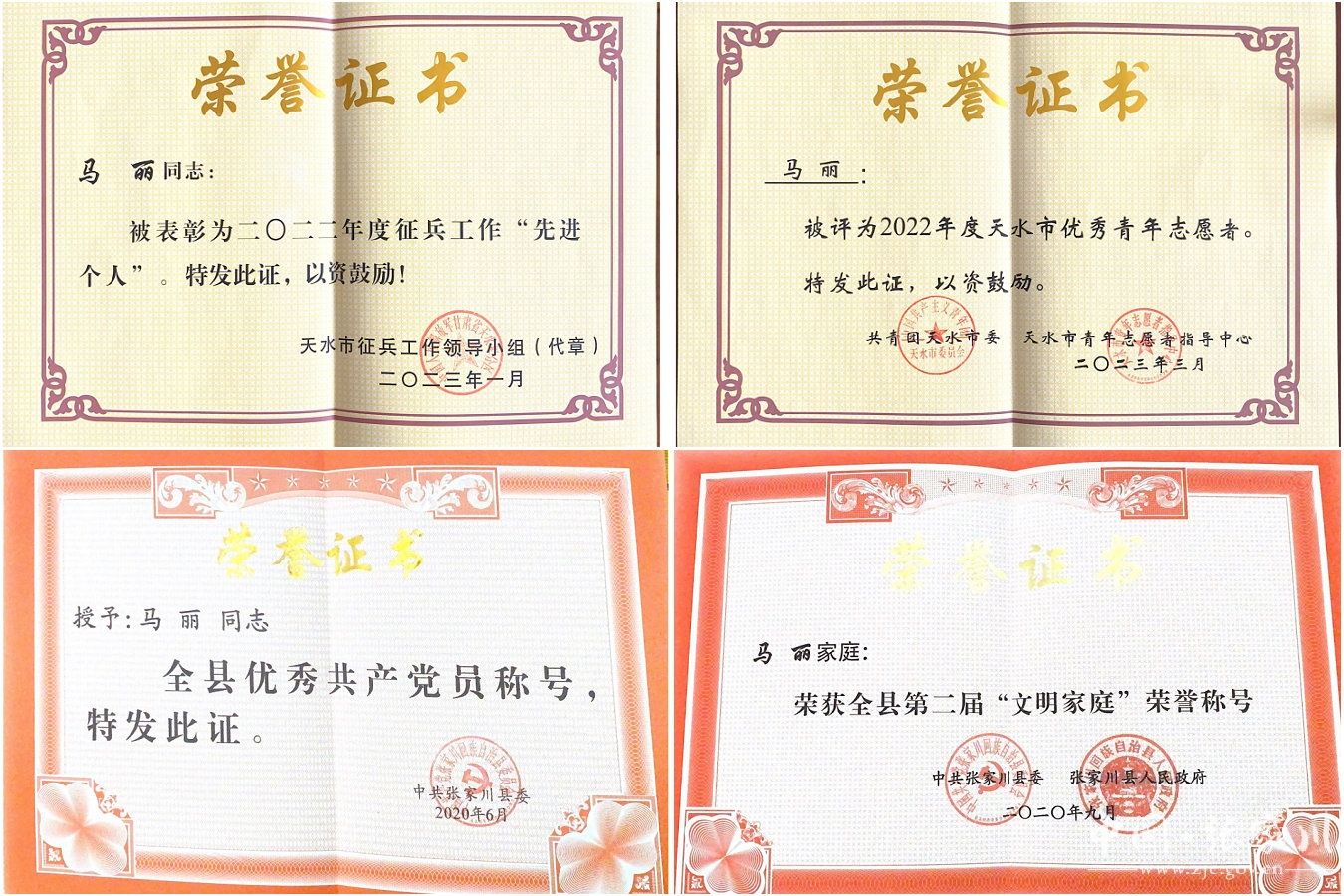 十年砥砺前行,正是她的严于律己、竭诚奉献,工作实绩突出,成效显著。2021年6月,她被提拔成为天水市唯一一名女性武装部长。在她的努力下,2021年12月,张家川镇被评为甘肃省国防动员和后备力量建设“先进单位”;其本人亦被评为2022年度天水市征兵工作“先进个人”。2023年3月被共青团天水市委授予“全市优秀青年志愿者”称号。被县委、县政府授予第二届“全县文明家庭”称号。2023年9月被甘肃省妇联推选为出席中国妇女第十三次全国代表大会代表。
