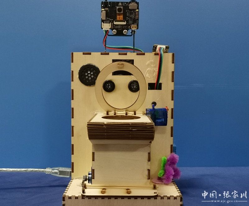 在学校的创客工作室里,摆放着许多学生的作品,其中正在执行“命令”的马桶格外引人注目。它就是杨琳同学的创客作品《智慧马桶》。这是一款基于人工智能技术的创新产品,旨在为用户提供更加智慧、卫生、健康、文明的如厕体验。通过人工智能摄像头检测用户性别,男生则默认抬起马桶圈,女生则马桶圈会自动放下。使用语音识别模块检测用户指令,并使用“小智”唤醒指令,下达“打开”、“放下”、“清洁”等控制指令。根据检测到的用户手势做出响应:向上挥手会打开马桶圈、向下挥手代表放下、画圈代表启动清洁功能。杨琳介绍道。