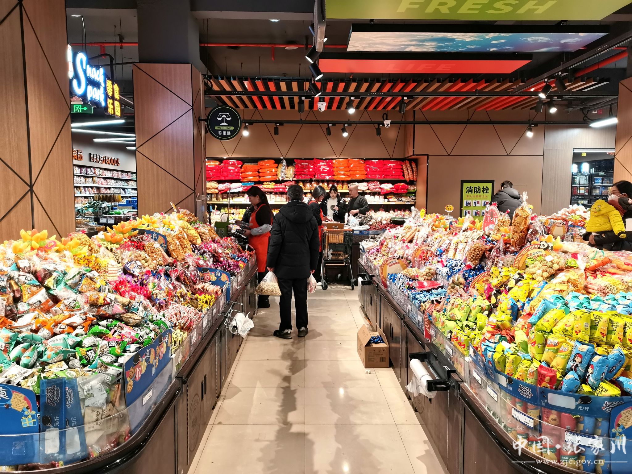 记者在走访好又多超市时看到,超市各式喜庆年货一应俱全,水果蔬菜、糖果坚果等年货已是纷纷“上架”,各类年货摆放井然有序,将浓浓的“年味”氛围拉满。