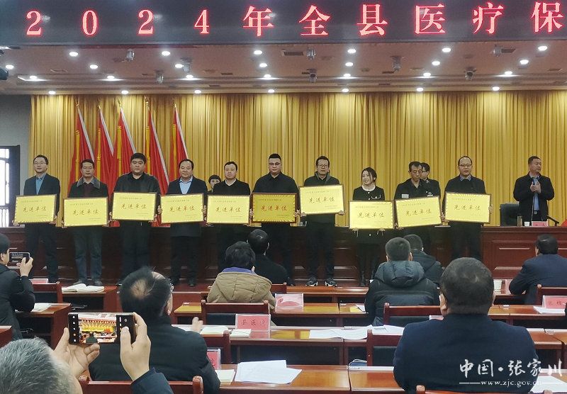会议传达学习了习近平总书记关于医疗保障工作重要指示批示精神以及全国、全省、全市医疗保障工作会议精神。宣读《关于表扬2023年度全县医疗保障工作先进单位的通报》并颁发奖牌。宣读《张家川县医疗保障局关于聘请马凤兰等15名同志为张家川县医疗保障基金社会监督员的通知》并颁发聘书。马鹿镇、县第一人民医院、甘肃陇中老百姓医药连锁有限公司五十五分店负责人作了交流发言。
