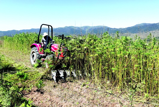 近日,在张家川回族自治县马鹿镇龙口村火麻种植基地里,种植大户开着收割机正忙着收割火麻。