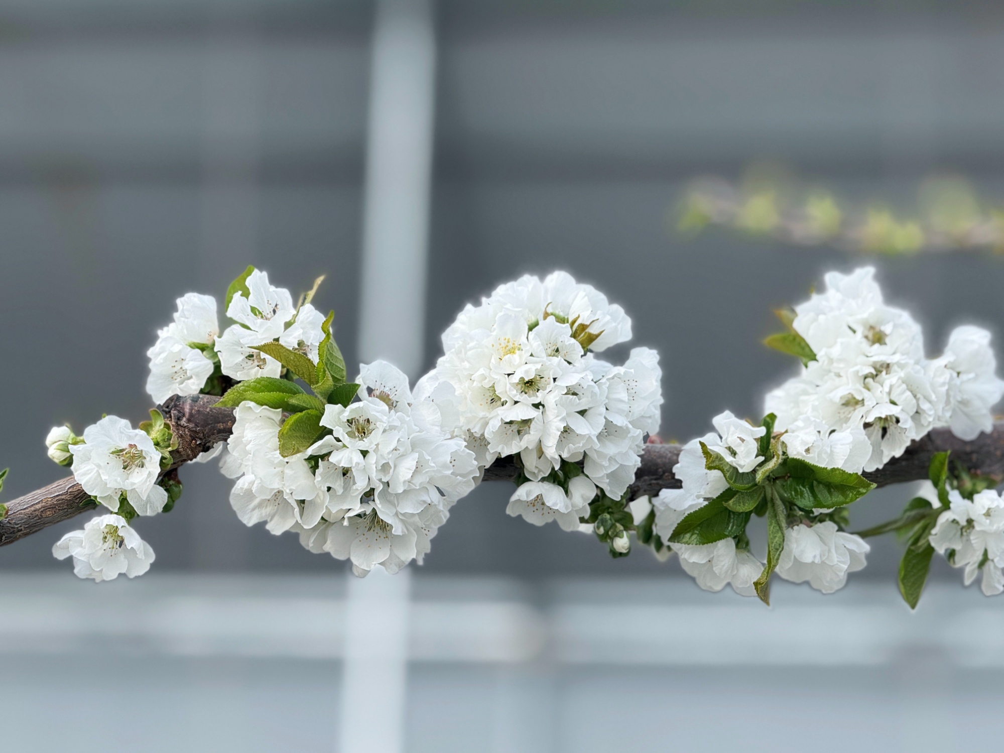 推开温室大棚的门,一股湿润的暖流裹挟着清甜的花香扑面而来。在20多度的环境里,樱桃花正值盛花期,层层叠叠的花枝间,50余名工人正俯身忙碌,有条不紊地进行人工授粉作业,忙碌的身影与绚烂花海构成了一幅生动的“春耕图”。产业园负责人县世亮穿梭其间指导作业,他抬手拂过一簇繁花介绍:“我们的大棚里面现在已经进入盛花期了,每天有50—60名工人正在进行授粉工作,把授粉工作扎扎实实做好,为今年的丰收打好扎实的基础。”