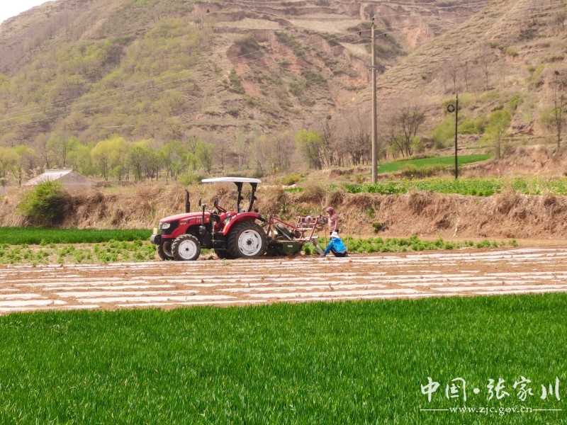 地处张家川县最西边的梁山镇以种植优质小麦而远近闻名。目前,岳山村“兰大211”高标准麦田里已是一幅绿意盎然的景象。另一边,满粮农机服务专业合作社的机械正在覆膜作业中,人工点籽作业也在同步展开,目前已完成玉米覆膜800亩,合作社雇佣当地村民十余人进行人力辅助,人均日薪资120元。岳山村党支部书记惠喜东介绍:“岳山村今年抢抓墒情好的有利时间,积极开展春耕生产,强化产业结构调整,找准定位,发挥岳山村抗旱冬小麦品种的优势,切实帮助群众增产增收。下一步,我们将增加种植面积,打造张家川县西部良种培育基地。”