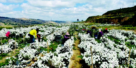 本报讯 时值深秋,在张家川回族自治县马关镇小庄村阴山小白菊种植基地,连片的小白菊一簇簇、一团团竞相开放,盛开的花蕾在风中摇曳,送来一阵阵清香,村民们提着篮子穿梭于花海中,熟练地采摘着小白菊,呈现出一派忙碌的丰收景象。