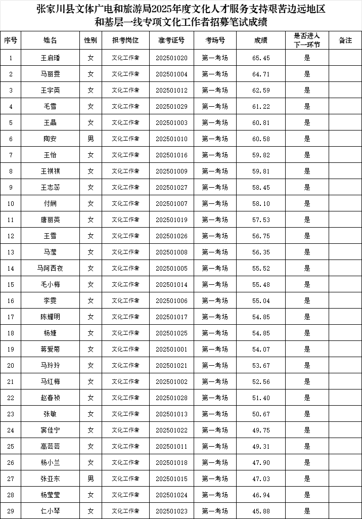 附件:张家川县文体广电和旅游局2025年度文化人才服务支持艰苦边远地区和基层一线专项文化工作者招募笔试成绩表