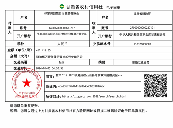 2023年12月18日23时59分,甘肃省临夏州积石山县发生6.2级地震,张家川回族自治县慈善协会及时启动预案,向社会各界爱心单位、爱心人士发出公开募捐《倡议书》,得到了社会各界爱心单位、爱心人士的积极响应。各爱心单位、人士踊跃捐款,帮助灾区人民抗震救灾和灾后重建,共渡难关。2023年12月23日15时至2024年1月5日16时30分,累计接收45家(单位/个人)捐款451412.35 元,捐款明细如下: