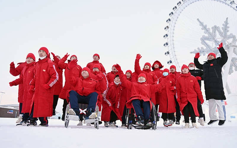 2023年2月9日,黑龙江省残疾人后备运动员集训队在第七届中国残疾人冰雪运动季北方主场活动现场合影。新华社记者 李贺 摄