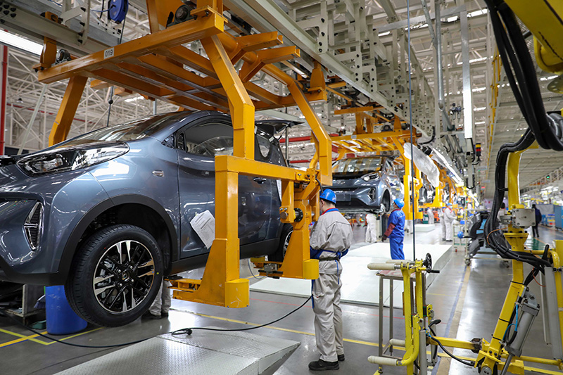 2月3日,工人在位于安徽省芜湖市的奇瑞汽车股份有限公司新能源二期工厂总装车间作业。新华社记者 曹力 摄
