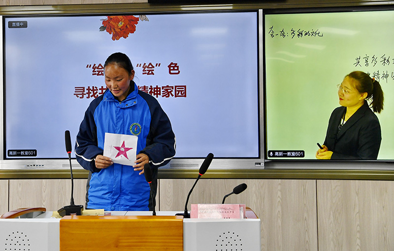 在“云校”课堂上,拉萨阿里地区高级中学一名学生(左)和西安高新第一中学老师互动(2022年4月8日摄)。新华社记者 张汝锋 摄
