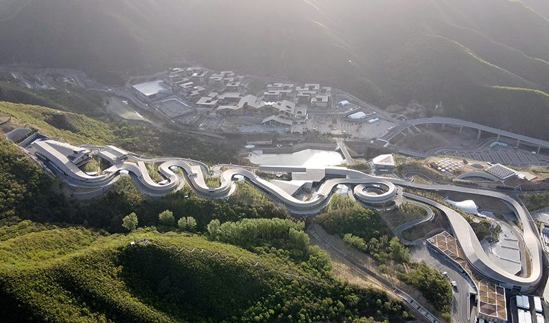这是2022年4月26日拍摄的国家雪车雪橇中心(下)和冬奥村(上)(无人机照片)。北京延庆奥林匹克园区于2022年4月29日正式向公众开放。新华社记者 张晨霖 摄