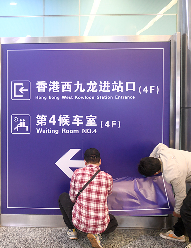 1月12日,工作人员在广州东站张贴广深港高铁候车室指引标识。新华社记者 卢汉欣 摄