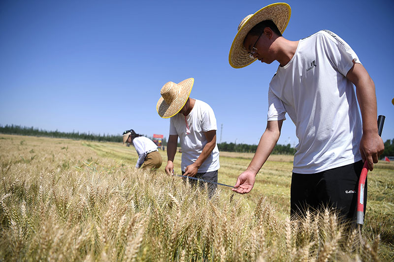 宁夏吴忠市红寺堡区富阳集团千亩高效节水农业示范基地,农业部门技术人员对小麦进行测产(2022年7月6日摄)。新华社记者 王鹏 摄