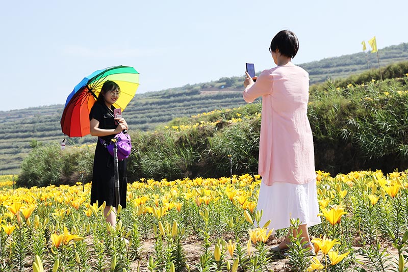 在宁夏固原市彭阳县金鸡坪梯田公园里,两名游客在百合花田拍照(2020年8月10日摄)。新华社记者 卢鹰 摄