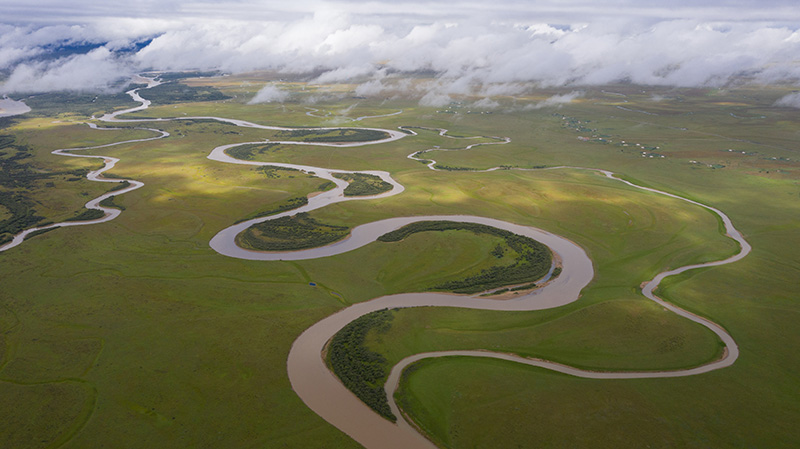 俯瞰位于四川省若尔盖县唐克镇的白河牧场的黄河出川口(无人机照片,2022年8月16日摄)。新华社记者 江宏景 摄