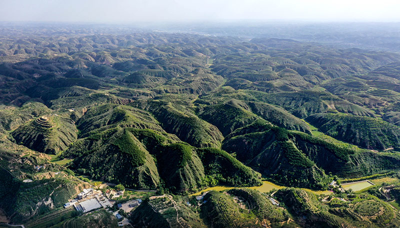 黄土沟壑中的陕西省榆林市米脂县银州街道高西沟村满眼绿色(2021年9月10日摄,无人机照片)。新华社记者 陶明 摄