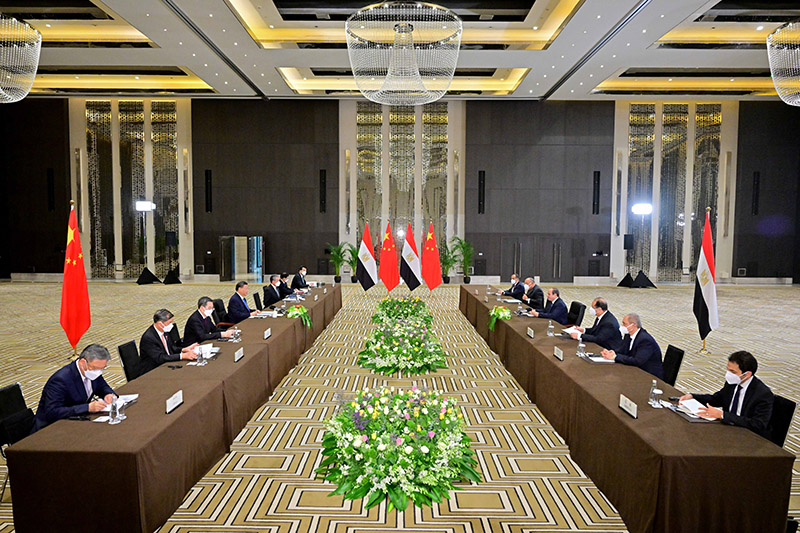 习近平强调,中方坚定支持埃及走符合自身国情的发展道路,坚定支持埃及维护国家主权、安全、发展利益,愿同埃方深化共建“一带一路”合作,推动如期高质量建成“斋月十日城”市郊铁路和新行政首都中央商务区,实施好“中埃苏伊士经贸合作区”等重大合作项目。中方愿从埃及进口更多优质产品,扩大投融资、疫苗联合生产、航天等领域合作。双方要推进鲁班工坊和中文教学,培养更多中埃友好的使者。中方愿同埃方以首届中阿峰会为契机,携手构建中阿命运共同体,就落实中非合作论坛“九项工程”加强对接。中方祝贺埃及成功举办联合国气候变化沙姆沙伊赫大会,愿在能源转型、绿色产业、低碳技术等方面加强交流合作。中方愿同埃方加强在联合国等多边平台合作,倡导真正的多边主义,维护国际关系基本准则,维护发展中国家共同利益,共同促进世界和地区和平稳定。