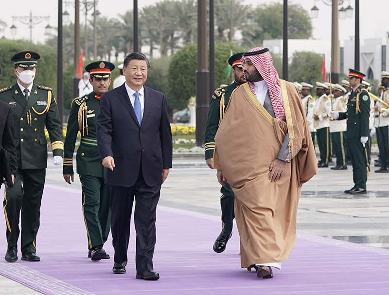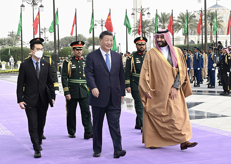 当地时间12月8日中午,沙特王储兼首相穆罕默德代表国王萨勒曼为正在沙特进行国事访问的国家主席习近平在利雅得王宫举行欢迎仪式。新华社记者 姚大伟 摄