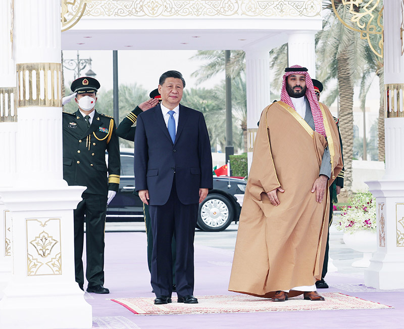 当地时间12月8日中午,沙特王储兼首相穆罕默德代表国王萨勒曼为正在沙特进行国事访问的国家主席习近平在利雅得王宫举行欢迎仪式。新华社记者 谢环驰 摄