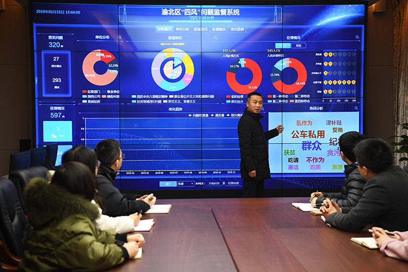 重庆市渝北区纪委监委工作人员利用“四风”问题监督系统进行线索分析(2019年1月15日摄)。新华社记者 王全超 摄
