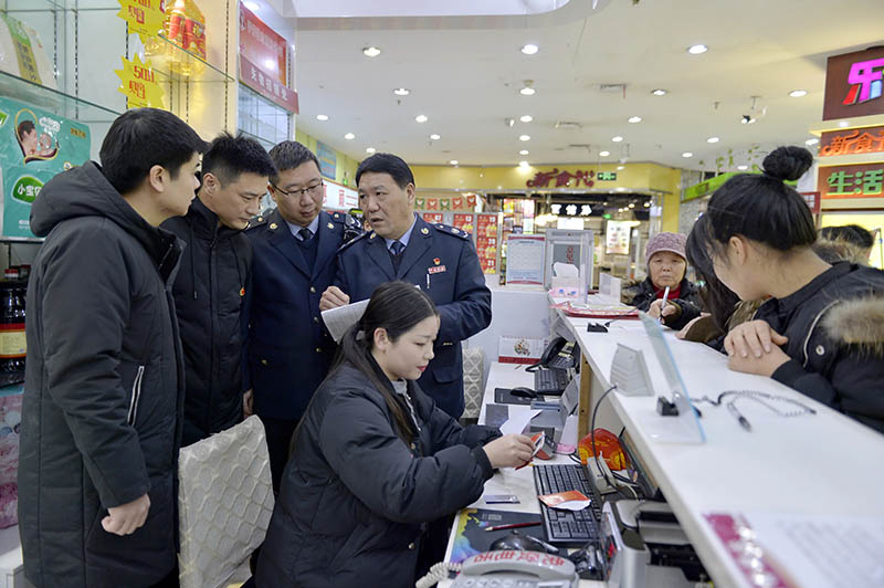 河北宁晋县纪检干部与税务稽查人员在当地一家超市检查是否有单位公款购买购物卡情况(2018年12月29日摄)。新华社记者 牟宇 摄