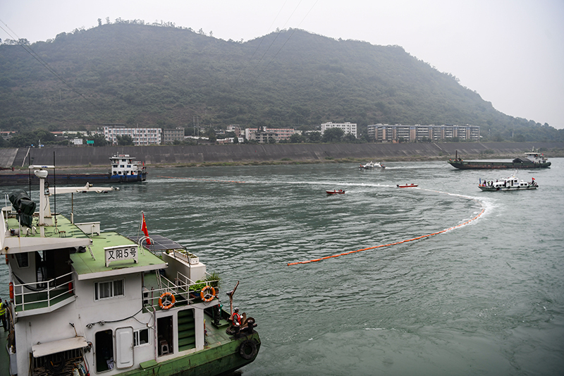 11月9日,在四川省宜宾市叙州区的长江流域突发生态环境事件应急综合演练现场,多方部门协作在金沙江面布设围油栏。新华社记者 王曦 摄