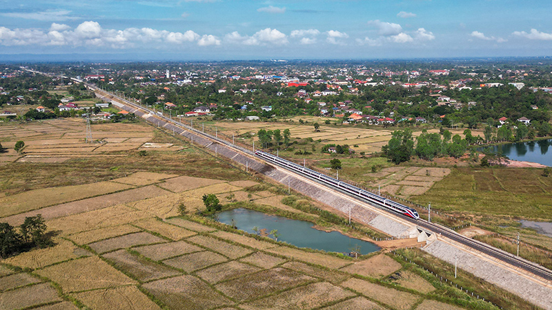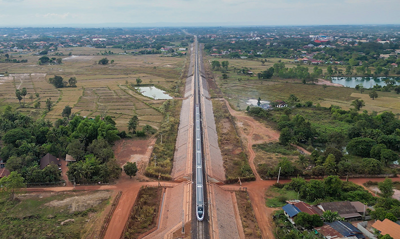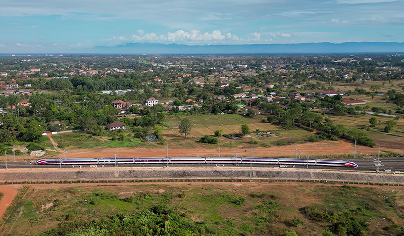 这张11月25日的航拍照片显示,“澜沧号”动车组行驶在老挝万象郊外的中老铁路老挝段上。新华社发(凯乔 摄)