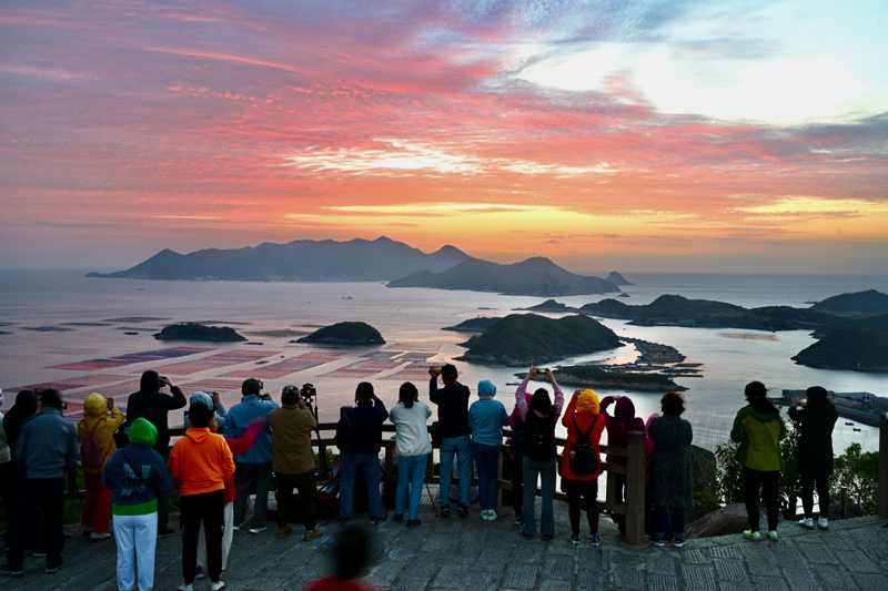 福建宁德霞浦县三沙镇花竹村海边,游客在拍摄日出(2022年10月26日摄)。新华社记者 姜克红 摄