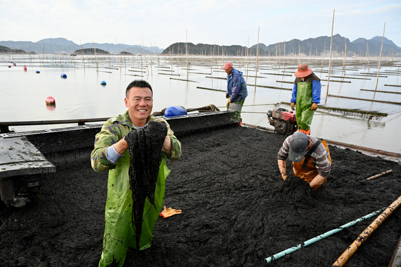 在福建宁德霞浦县松山街道沙塘街村海边,渔民林瑞波展示收获的头水紫菜(2022年10月21日摄)。新华社记者 姜克红 摄